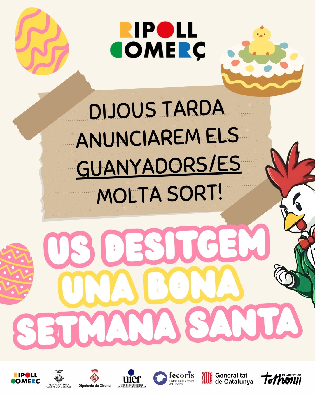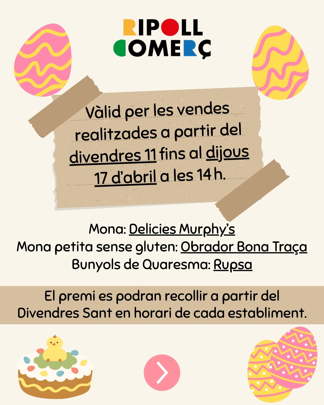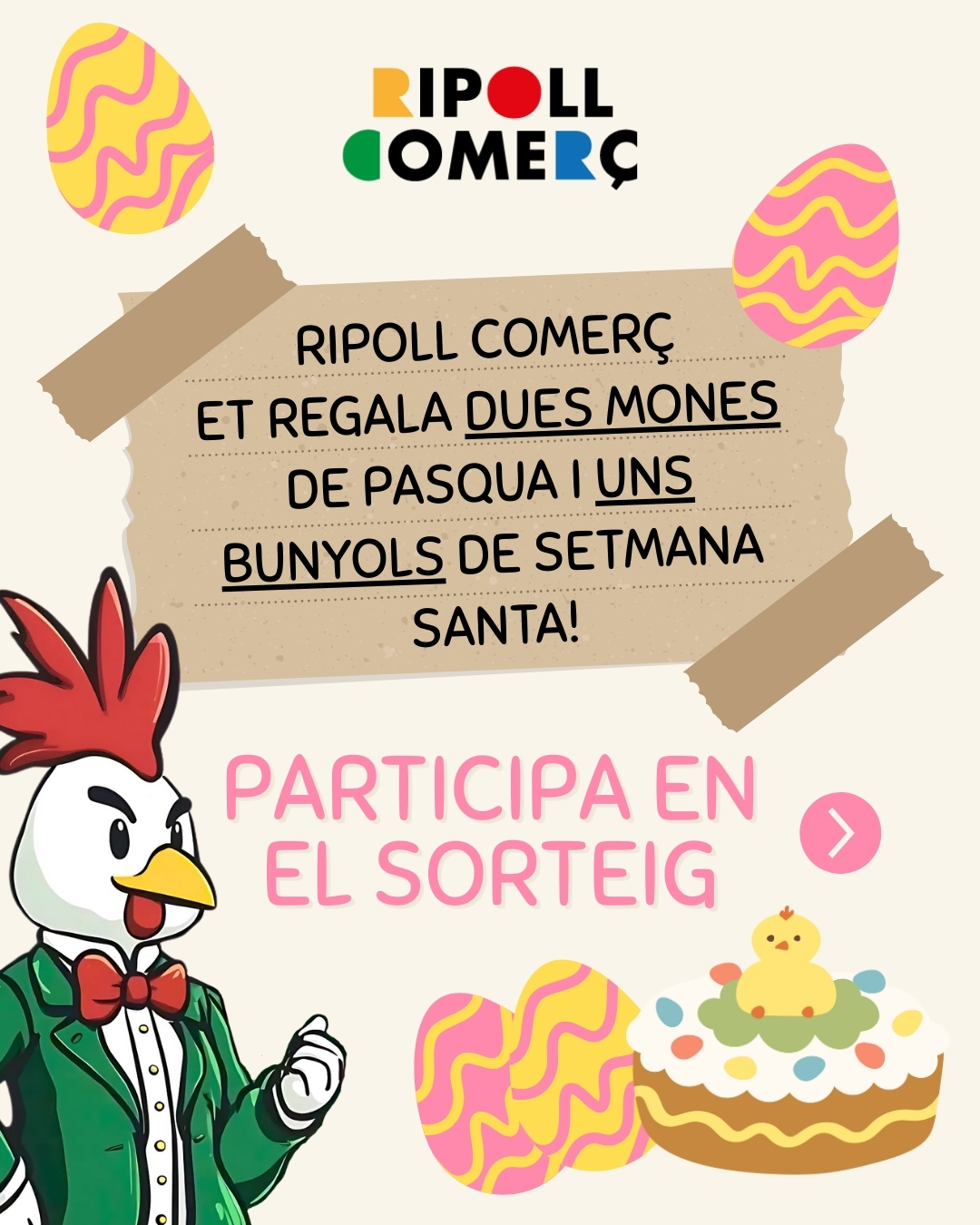 Per Setmana Santa, Ripoll Comerç vol fer-te un regal molt especial. Sortegem dues mones de Pasqua i uns bunyols de Setmana Santa!! No et perdis l’oportunitat de guanyar aquests fantàstics regals!